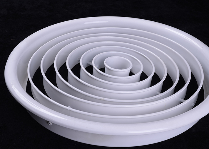 結構外觀為圓形,內心有多個圓環組成,能可上下45度調整風口阻力小,適用于劇院,體育館及樓層較高的場所,可附加風量調調節閥。產品外形美觀外。表面采用靜電噴塑,烤漆或者陽極處理。選用優質加厚鋁合金材料,更加耐用